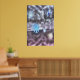 Large blue tinted snowflakes hang suspended in the air in front of bare tree branches overhanging impressionistic fantasy-like mauve tinted snow flurries int the background.