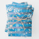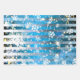 Beautiful winter themed wrapping paper sheet design featuring snowflakes, sparkles and lights on a blue striped background.