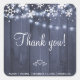 Editable text favour sticker featuring rustic white snowflakes, three small hearts and twinkle hanging lights with a white editable thank you script on dark blue grey barn wood background. Ideal for your winter elegant rustic seasonal wonderland themed wedding, baby shower or other occasions.