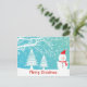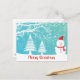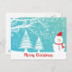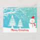 Cute snowman with red hat and scarf and abstract snowflakes in the snowy woods. Customisable postcard template
