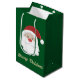 This cute santa claus and snowman gift bag will please kids of all ages! The front of the bag has a cute cartoon portrait of Santa Claus, with the stylised text in light gold that says "Merry Christmas". The back of the bag (shown) has an adorable snowman carrying a red and white striped candy cane which is tied with a pretty green bow. At the bottom are two text fields for your personal message. The images and text are placed on a dark holiday green background. Cute!