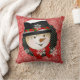 Snowman and Snow Lady Snowflakes holiday pillow, so pretty and colourful, features a white snowflakes on red background with a black circle with white dots and one side has a snowman with black top hat and red bow tie, the other side a snow lady with a red and green winter hat and striped scarf!