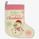 A cute Christmas stocking to hang from the mantel of a snowman with a santa hat and carrot nose in pink, red and green with the phrase - Believe in the Magic of Christmas!