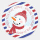 Wrap up mailing or your holiday gift with a pretty round seal that features an air mail envelope's borders in dark blue and red. It has an illustration of a Snowman in a cosy scarf and winter hat. The text is all personalizable and it reads NORTH POLE POST OFFICE - SPECIAL DELIVERY FOR ...