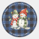Blue buffalo plaid Christmas return address labels featuring two dressed snowmen. Easily personalise these cute Christmas labels with your name and address.