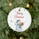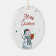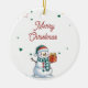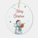 This charming Christmas card design features a cheerful snowman with a joyful smile, dressed in a cosy green-and-white striped scarf and a matching Santa hat. The snowman stands proudly on a snowy patch, holding a bright red gift box tied with a golden ribbon — symbolising warmth and generosity during the holiday season. Its carrot nose, rosy cheeks, and button details add a classic festive touch.