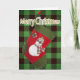 This sweet Christmas card cover features a photograph of a homemade red and green stocking with an adorable snowman dressed with a seasonal plaid scarf and hat set over green buffalo plaid. Personalise the inside greeting, remove any text or click customise to select a font style, size, and colour you like.