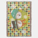 Snowmen Couple Dots and Argyle holiday throw, so pretty and colourful, features a brown, orange, aqua, mustard, and cream argyle background with a mustard yellow circle with white dots and a smiling snowman couple with a hat, scarf, carrot nose, and snowflakes!
