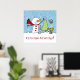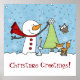 A cute snowman in a snow banked area reaches to the top of a small pine tree to put a snowflake on top. Woodland animals consisting of owl, fox and rabbit look on in this winter scene. Personalise this Christmas design as you wish. Original design by Christie Black of Creations from the Heart.