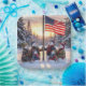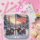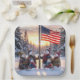 A family of snowmen stands proudly in front of a tall flagpole, with the American flag gently waving against a backdrop of snow-covered trees, as the sun casts a warm glow over the scene