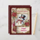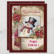 This holiday scrapbook paper features a snowman in a black top hat, wearing a red scarf, as the main element on a junk journal page. Flowers, snowflakes, and gold filigree, with text, complete the page. The back is dark wine-red, with snow falling across it. Very beautiful and festive, and perfect for your holiday memories!