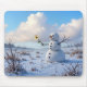 In a tranquil, snowy field, a snowman holds a daisy flower in one stick hand, while fluffy clouds drift across a brilliant blue sky, crafting a serene and picturesque scene that captures the essence of winter's beauty