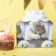 A snowman with a carrot nose holds a contented tabby cat against a snowy backdrop, where the cat has its eyes closed, seemingly enjoying the embrace
