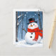 Snowman in cold forest with red scarf postcard