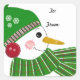 A cute snowman with a carrot nose and rosy cheeks. Red ear muffs and a green hat and green scarf.