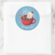 Decorate your Christmas presents with a cute and humourous Christmas greeting decorative sticker. It comes with a cute snowman enjoying a dip in a cup of hot cocoa chocolate with a candy cane. It is melting though. Send warm wishes and a smile to the recipient.