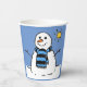 Cartoon illustration of a snowman on a sunny day. Paper cup for Christmas.