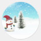 This simple image is of a snowman standing out in the snow amongst pine trees.