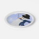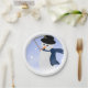 Cute digital drawing of a snowman holding onto his hat in a windstorm. He has a blue scarf and carrot nose and is set against a blue background.