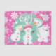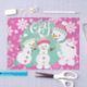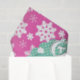Holiday tissue paper with a whimsical, colourful design featuring a hot pink with white snowflakes background, a circular of aqua blue with little white polka dots, and three adorable snowmen with pink and blue winter hats and scarves and white text that reads Joy!