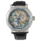This image features a Snowman Let It Snow Blue Watch with a charming, rustic winter scene. The central design displays a smiling snowman wearing a blue striped hat and scarf. The background is a vertical wood plank sign that reads "let it snow". The scene includes various elements of winter foliage, blue berries, pine needles, and large snowflakes. The watch face is surrounded by a decorative border of blue, white, and tan stripes. The overall color palette is dominated by various shades of blue and brown.
