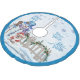 A beautiful blue tree skirt for your Christmas tree featuring our adorable snowman with his cute fur-buddy wearing a Santa suit as they enjoy a snowfall.