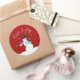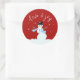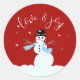 Christmas "Love and joy" envelope seals with happy snowman illustration.  Red with white text that curves over the snowman who wears a blue scarf and black top hat.  Stickers come in two sizes.
