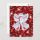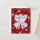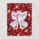 This winter postcard features a cute snowman making a snow angel on a red confetti heart background. -