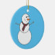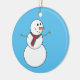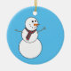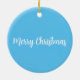 Adorn your holiday tree with this festive ornament that features a happy snowman against a sky blue background on one side, and the greeting "Merry Christmas" in white letters against a blue background on the flip side. Various shapes and sizes are available. Artwork by Buttercup's Clothing and Collectables.