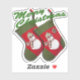 This Christmas sticker design features a duplicate photograph of a red and green stocking with an adorable snowman dressed with a seasonal plaid scarf and hat set.