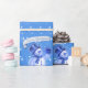 This is an adorable snowman on a frosty blue background with a pattern of snow and stars.