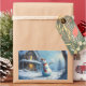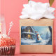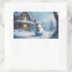 A pleasant, colourful, winter painting of a snowman outside a house.