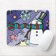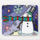 Snowman art featuring a winter scene with a snowman whose scarf is blowing in a blizzard, and large, colourful snowflakes.