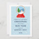 This adorable and modern Christmas holiday greeting card is great for the holiday season. It features a hand-drawn snowman snowglobe baked cookie illustration in red, blue, and green on top of a pastel blue background with white falling snowflakes on the back are similar snowflakes and navy blue sky. It's cute, artsy, fun, and playful for the winter season!