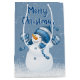 Cute snowman with a blue stocking cap in snowflakes on a blue background.