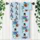 A charming snowman, warmly dressed in a bright blue coat and light blue mittens, arms open wide as if inviting you to share in the joy of the season. Topping off the look is a classic black top hat. Beside the snowman, two large snowflakes and a vibrant red poinsettia that brings a festive pop of colour. All set against a soft light blue backdrop