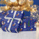 This is fun Christmas wrap for all ages! Images on a bright blue background include a striped stocking, a snowman with a hat and striped scarf, a green Holiday tree, snowflakes, and the text in white "Merry Christmas!" and "Happy New Year!" Festive for the Holiday season.