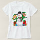 A white t-shirt with a cartoon image of a snowman with a black hat and a red and green scarf, surrounded by two cartoon elves and several wrapped gifts. The elves are wearing green outfits and hats, and one is holding a small gift. The gifts are wrapped in red, blue, and green paper with bows. The snowman has a carrot nose and black buttons. The image is a simple, colourful cartoon style.