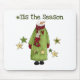 An old country look snowman wearing a green and red gown, bunny morning slippers, and a scarf, green and gold stars, and text that reads "Tis the Season" on snowman theme T-shirts, cards, mugs, magnets, tote bags, and more.