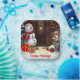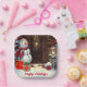 This is an adorable Christmas paper plate featuring a scene of a cute snowman with gifts at the front door of a house in a vintage watercolor style. The text on the plate can be personalised with your own or left as is.
