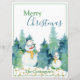 Adorable snowmen with watercolor tree background. “Merry Christmas” greeting for your family and friends.