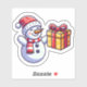 A cheerful snowman adorned with a striped red and white scarf and a cosy winter hat smiles brightly while holding a beautifully wrapped gift.