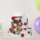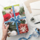 An adorable snowman with festive baubles and pine cones on a white background with "Let it snow" script on holiday wrapping paper.