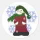 A snowman dressed for winter in a green hat and scarf. Red sweater and pants with black boots. Big blue snowflakes around him.