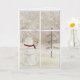 snowman in winter woods with gold Christmas star ornament with snowflake windowpane framing