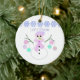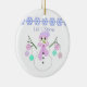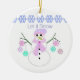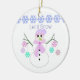 A cute snowman with branches for arms, holding colorful snowflake ornaments. A border of blue snowflakes accents the top. The saying 'Let it Snow' can be changed as desired.