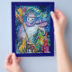 Colourful ,whimsical and funny acrylic painting by Bulgan Lumini (c).Snowy Winter night with snowman,christmas tree,toys, cat,owl,puppets,ornamental plants and holly berries in vibrant yellow,blue,green,red,white pink,colours .
