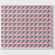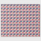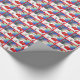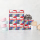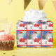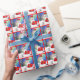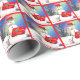 Wrapping paper with my artwork of a smiling snowman wearing a festive red and green hat holding a red Christmas gift.