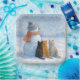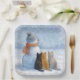 A snowman with a warm hat and scarf sits in a snowy landscape, while three cats gaze into the distance as snow falls gently around them.