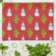 Cute kitchen towels with watercolor snowmen and Christmas trees pattern on festive red background